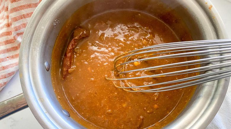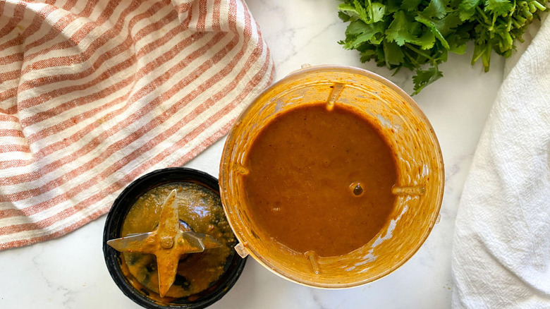 Once the mole is cool, put it in a blender and purée everything until you're left with a smooth sauce. Hahn advises storing the mole in a lidded jar, adding that "it will last great for up to a week." As to how you can use it up within that time frame? Mole goes well with chicken, fish, or pork. It will also complement Mexican dishes such as enchiladas. "I have even used it [as a dressing] on taco salad," Hahn says.