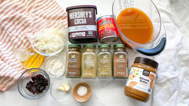 As mole is a pretty complex sauce, you will need a number of ingredients — even for this simplified version. Dry seasonings used in this recipe include chili powder, cumin, oregano, cinnamon, and salt. You'll also need fresh garlic, an onion, canned chipotle peppers in adobo sauce, and some raisins. Other necessary ingredients include broth (Hahn uses veggie broth, but chicken broth works great here as well), cocoa powder, a neutral oil, flour, and almond butter. Hahn also notes that you can use peanut butter instead — or sunflower seed butter if you're allergic to nut butters.