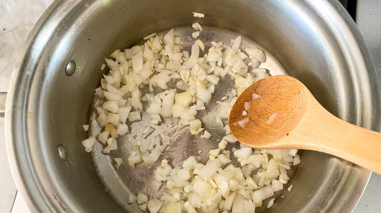 Before you start cooking, you'll need to chop the onion and garlic. Heat the oil in a saucepan over medium-high, then sauté the aromatics for about 8 minutes until they are soft.