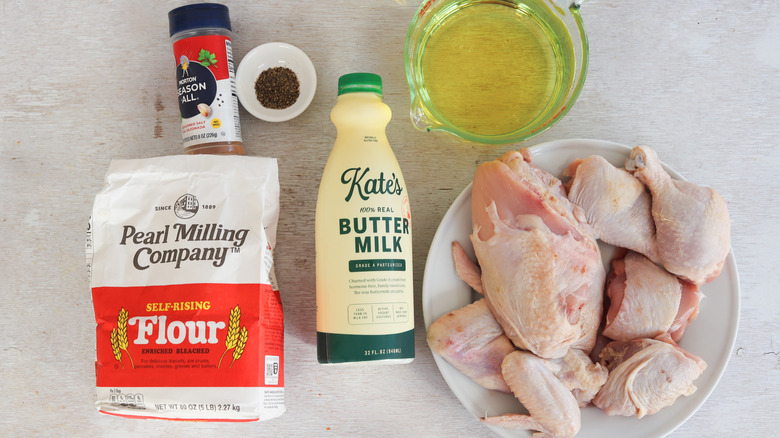 Perfect buttermilk fried chicken starts with buttermilk, of course! Pick up fresh buttermilk or use one of the substitutes that we list below. Seasoned salt and black pepper are added to the buttermilk for a simple and super-flavorful marinade. The acid in the buttermilk helps tenderize the chicken and infuse it with flavor. We like to use a whole chicken for this recipe. The chicken is typically wrapped well and stays extremely fresh. Breaking down a chicken is a skill, but it's pretty simple to execute. You can also just use whatever chicken pieces you prefer, whether that be white meat or dark meat pieces. You can choose to use boneless pieces, as well. The chicken is coated in seasoned self-rising flour. The self-rising flour makes adds an amazing, tender crunch to the chicken, so we don't recommend substituting it with regular flour.