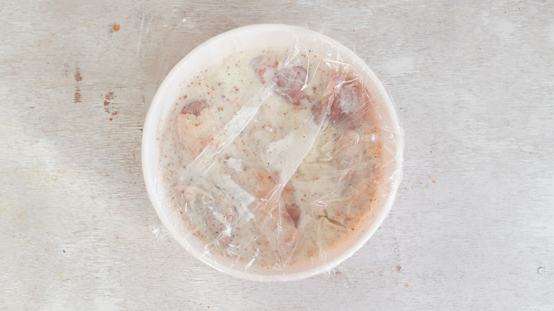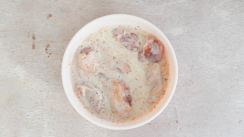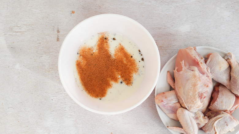 - Add the chicken to the seasoned buttermilk and completely coat the chicken.