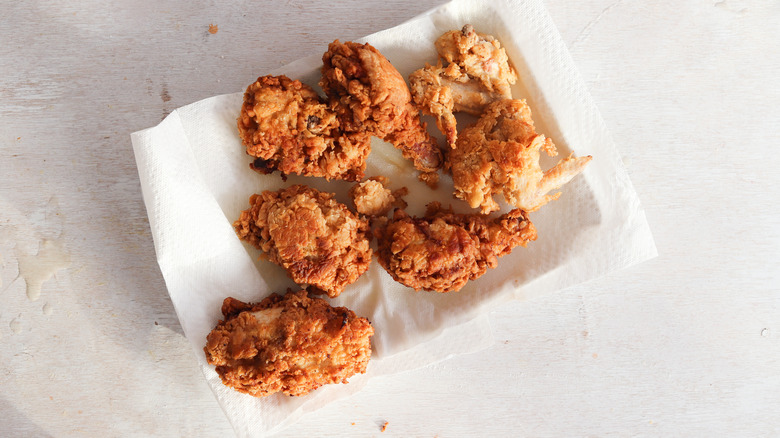 - Remove the chicken from the oil and drain on a paper towel–lined plate.