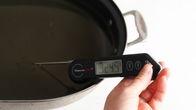 - Heat the vegetable oil in a large skillet until it reaches approximately 325 F.