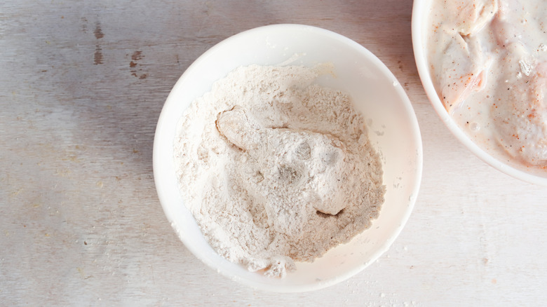 - Remove the chicken pieces from the buttermilk one at a time and coat them in the flour mixture, pressing the flour onto the skin of the chicken.