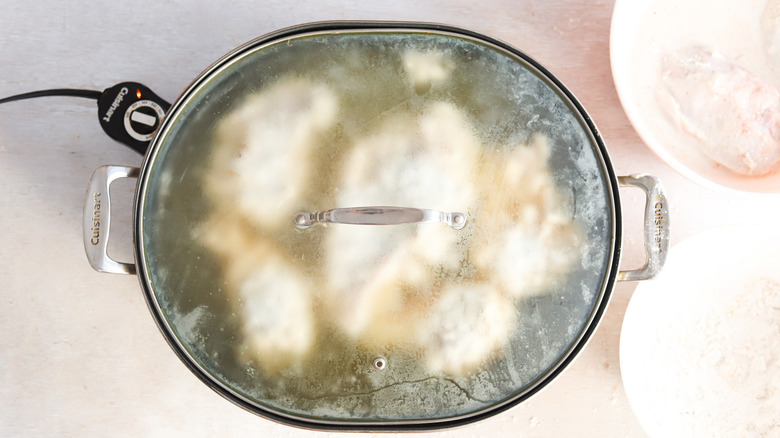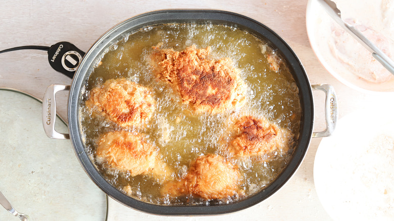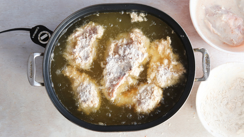 Turn the chicken and continue frying until the internal temperature reaches 165 F, about 15 more minutes. The breasts will take longer than the remaining pieces, so make sure to check each piece.