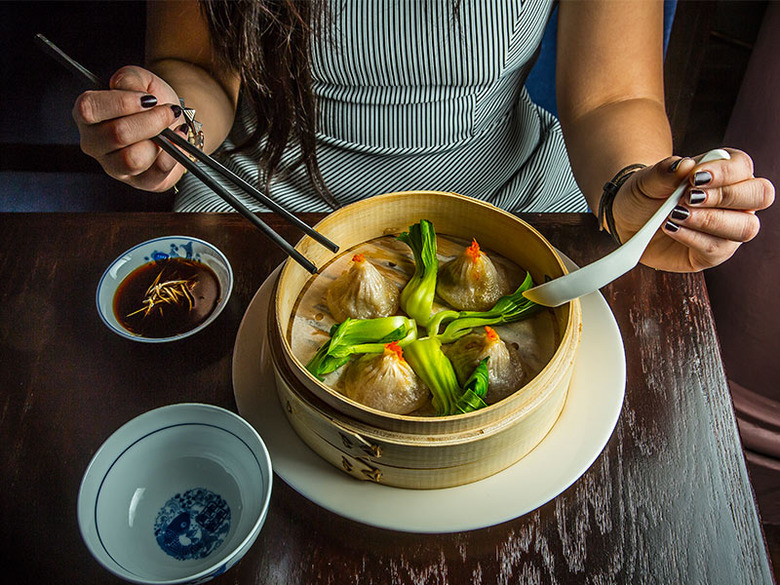 The dining room at China Blue; a server presents steamed soup dumplings.