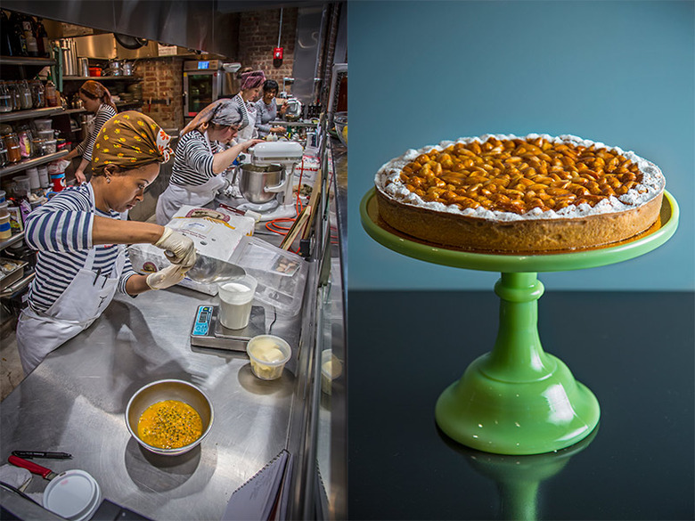 Chefs are hard at work behind the stainless steel pastry case. Our new favorite dessert? The bakery's almond hazelnut tart.