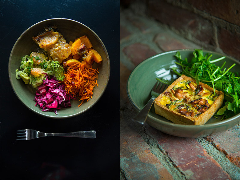 The bakery's signature assiette de legumes, a beautifully composed vegetable plate, and the daily quiche with greens.