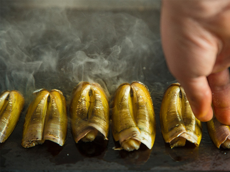 NYC's Casa Mono, the Spanish venture from Andy Nusser and Mario Batali, is celebrating its tenth anniversary this year. Spanish dishes like these razor clams on the plancha have become its signature.