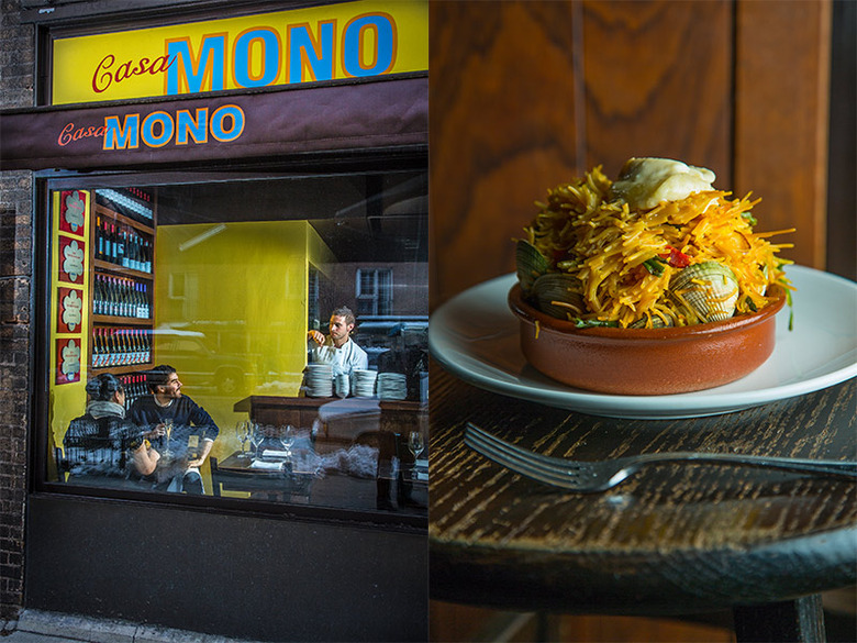 The exterior of Casa Mono from Irving Plaza; a signature dish of fideos with clams, noodles and chorizo.