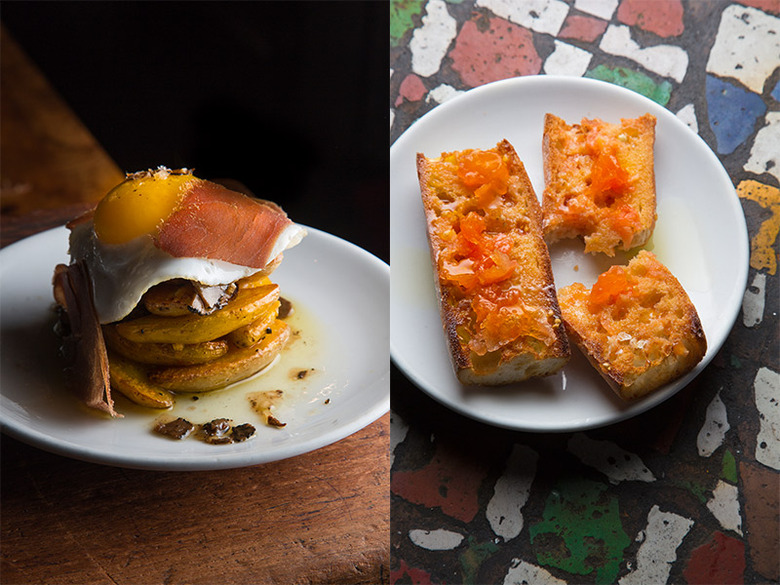 Duck egg with mojama and black truffles; a classic pan con tomate.