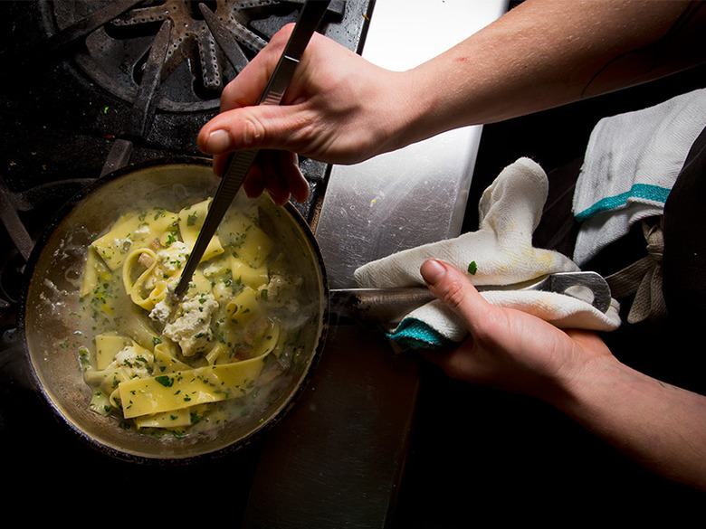 Housemade pappardelle is tossed with a brothy ragu made with guanciale and leeks.