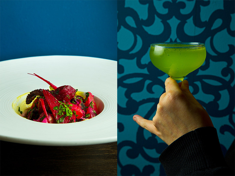 Charred octopus with beets; the restaurant's spicy gin cocktail, The Wadsworth.