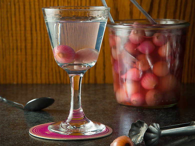 Start the evening off right with an ice-cold Gibson, which is garnished with pink pickled pearl onions, of course.