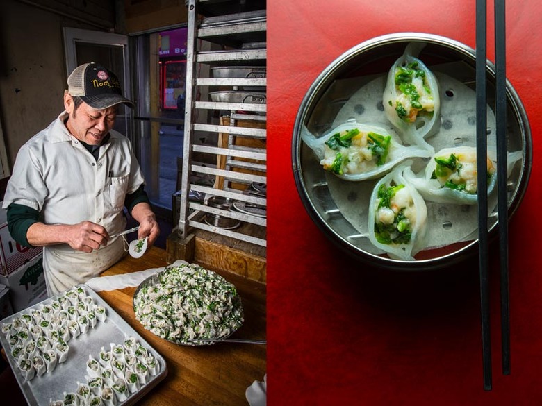 Nom Wah Tea Parlor's head chef folding together the shrimp and snowpea leaf dumpling ($4.50 for four); a tin of the freshly steamed dumplings.