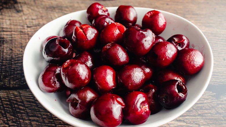 Start by washing your cherries and removing all the stems. Then, using the pointy end of the chopstick, push upwards into the cherry from the non-stemmed end to make a shallow hole. Remove the chopstick from this end and use the square end of the chopstick to push the opposite way to loosen the pit and push it out through the non-stemmed end. You can use the same trick for pushing out olive pits; just pick an end to start with since you won't have a stem.