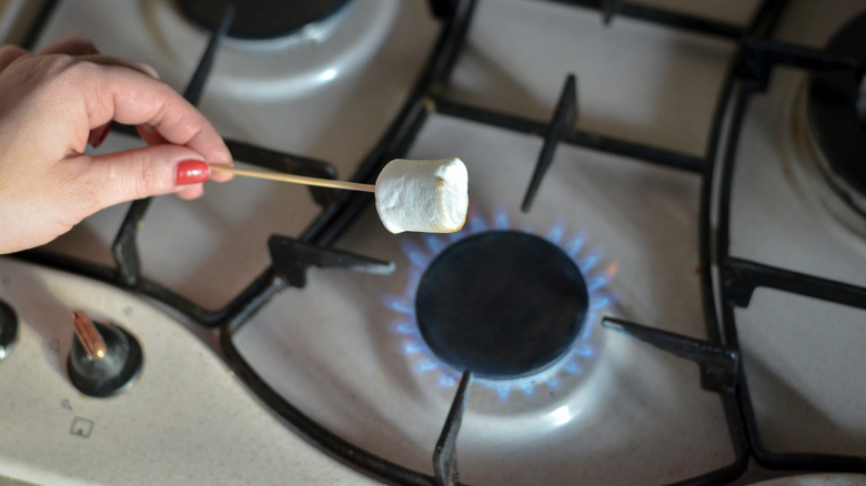 You can use a gas stove to craft the perfect s'more without stepping outside. Start by using a wooden or bamboo chopstick to skewer your marshmallow. If you're working with kids and an open flame, you may want to have the adults do the toasting or use a longer skewer to prevent burns. You should also always avoid reaching over the flame and stick with the burners closest to you when toasting your marshmallows.