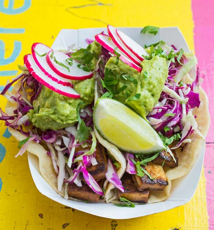 For the vegetarians, tofu tacos made with a lot of care, loaded with extra guacamole.