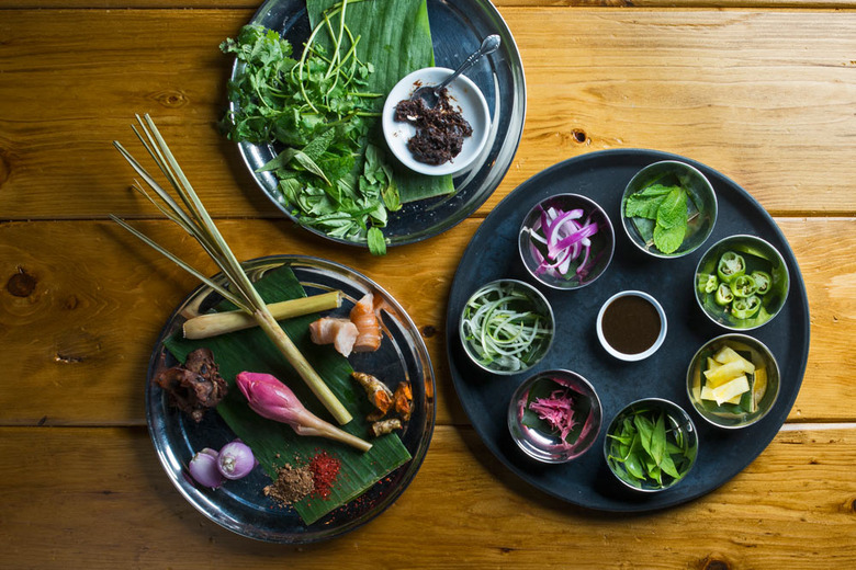 Asam laksa, the sour noodle soup from northern Malaysia, involves many ingredients layered together in harmony, and a fish broth rich with toasted belacan, the Malaysian fermented shrimp paste, and aromatics such as galangal, lemongrass, shallots and chile. [Photo: Tasting Table]