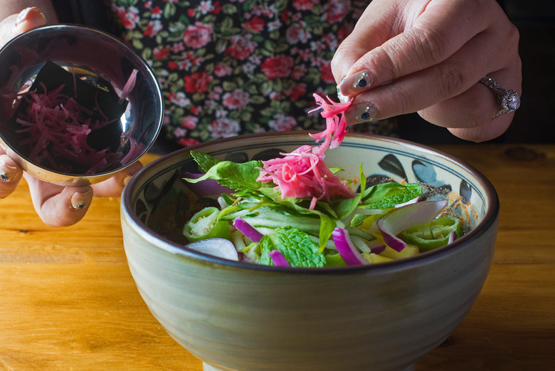 The broth and noodles are topped with fresh ingredients, including Vietnamese mint (also known as laksa leaves), pink ginger flowers, red onion and chiles. [Photo: Tasting Table]