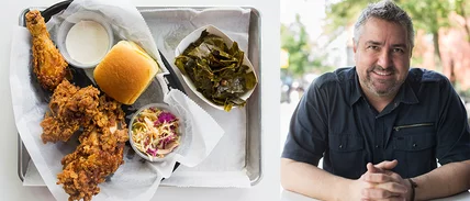 It's a mantra well represented by fried chicken on a stick: A crackly, chicken-y find from an Oxford, Mississippi gas station. "It's genius," he gushes. "It's a grab-and-go kind of thing."