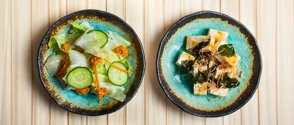 So, what exactly is a traditional Japanese salad? Yukimi explained to me that's it cubes of tofu, ribbons of seaweed, peppery mizuna and dried bonito flakes—all drizzled with apple-tinged shiso dressing.