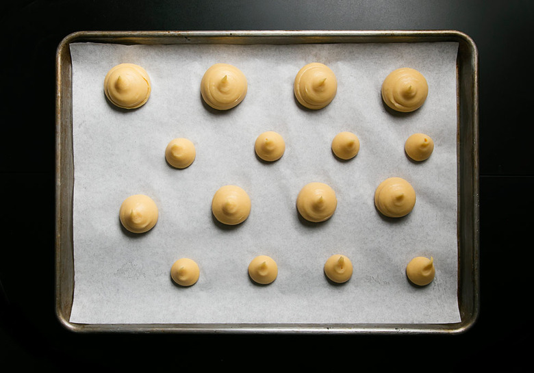 The final product: perfectly globular gougères. Ansel doesn't trace circles beforehand. Instead he relies on gentle, constant pressure to pipe out even balls of dough.