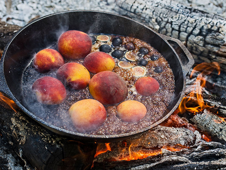 Mallmann cooks peaches and figs in a cast-iron pan over an open flame (see the recipe) until they caramelize.