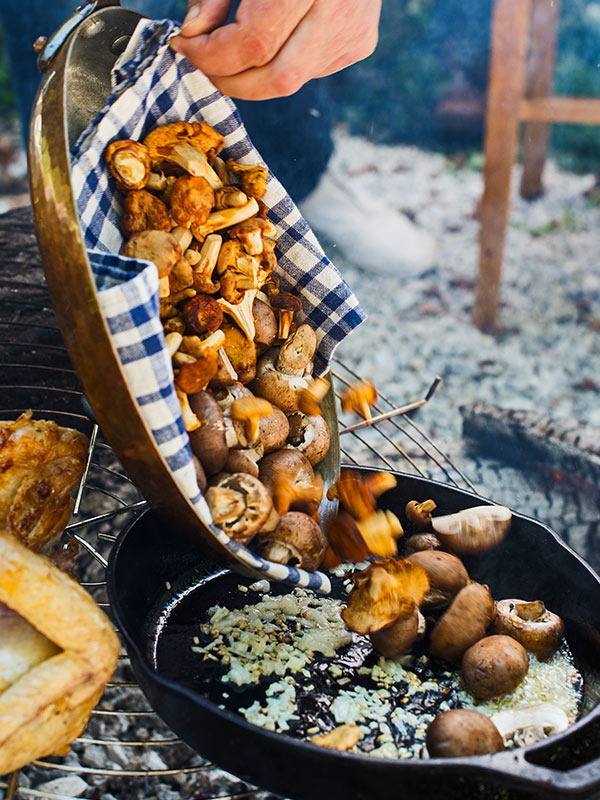 Mallmann pan-roasts mixed wild mushrooms in butter to serve with the chicken.