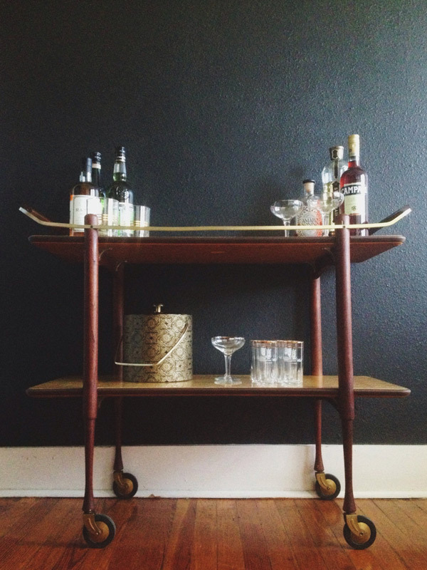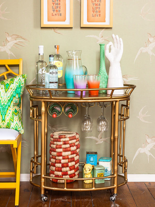 Improvise with an old-school bar cart, which has enjoyed a renaissance of sorts in recent years. Equal parts style and function, they pull double-duty (storage and serving), while instantly adding a cool retro vibe to any space. Most have wheels, so you can scoot them around as you see fit, but we prefer treating them as a piece of furniture.