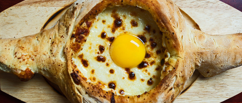 At first, it seems like a joke. There's no way they can be serious, you think, as the giant flatbread is deposited unceremoniously before you. It's shaped like a football, with puffy crusts surrounding a moat of molten white cheese called sulguni. On top of the cheese is a barely cooked egg, its yolk peeking out over the sea of dairy. And then the waiter gives a little nod, leans over, and starts mixing the egg into the cheese, leaving you with an enormous, delicious bread boat to contend with. This is khachapuri adjaruli, and it's serious business indeed.