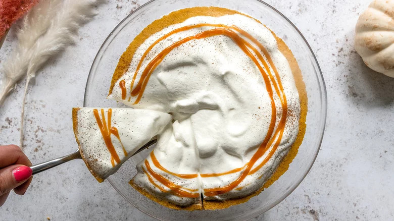 Like many similarly-themed desserts and drinks, this cake is full of pumpkin-spiced goodness and topped with a dollop of whipped cream. The best part is — because it starts off with a boxed cake mix — this dessert is easier than pie.