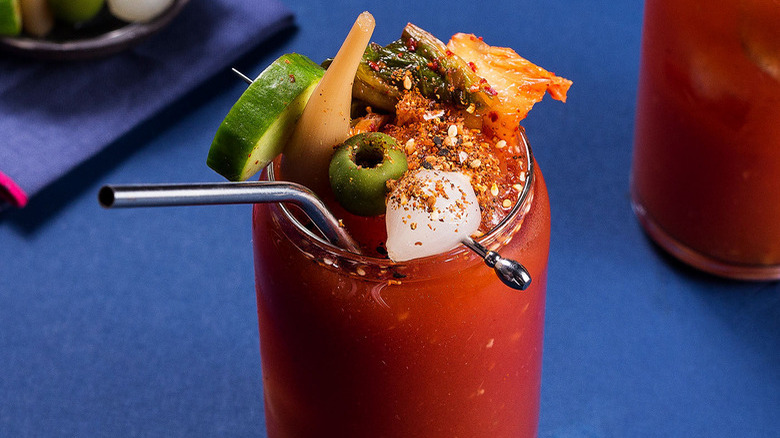 Kimchi is the star of this spicy Bloody Mary, which adds a unique touch to the familiar brunch cocktail. The drink — famous for its fun garnishes like celery, olives, and even shrimp cocktail — includes some ingredients you have maybe never thought about adding to it like fish sauce, wasabi, and togarishi, a Japanese spice blend made with orange peel, red pepper flakes, sesame seeds, and poppy seeds (via Food52).