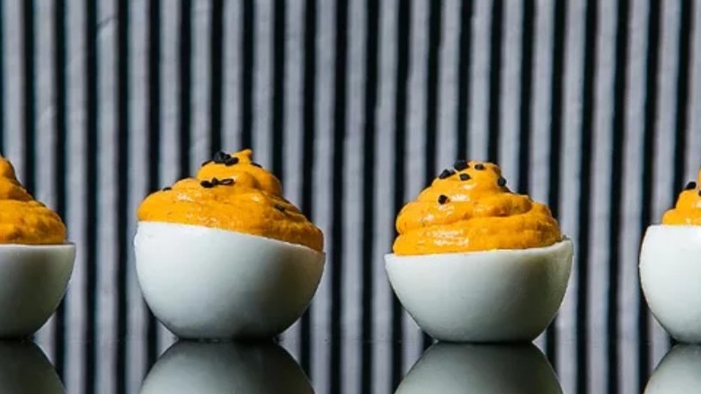 A true party classic (deviled eggs have been around since at least 1877, per Southern Kitchen, when a recipe for the appetizer appeared in Alabama newspaper "The Montgomery Advertiser"), there are more than a few ways to enliven your standard deviled egg recipe — and this one makes use of kimchi to kick the eggs up by a notch or two.