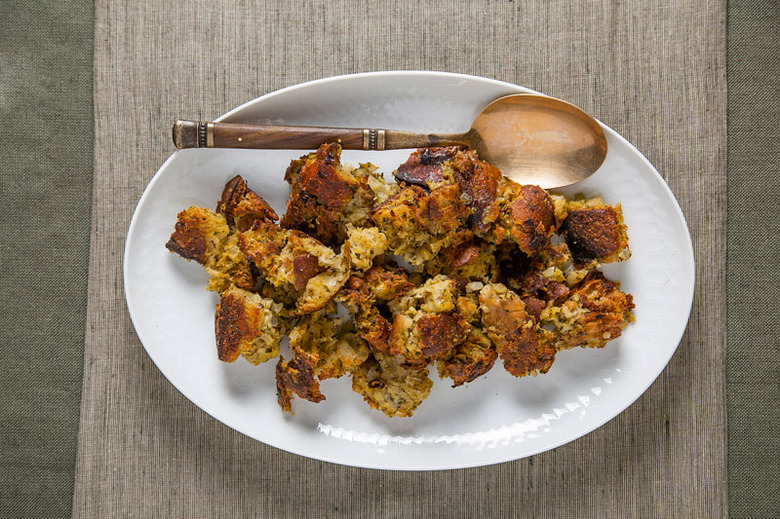 The stuffing may be the most traditional thing at our table (see the recipe), but it's got a few cheffy touches: fresh fennel, lots of herbs, good country bread, some white wine.