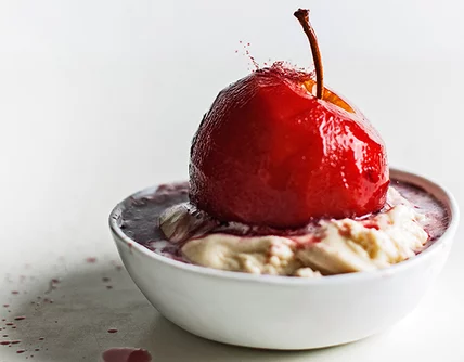 Why go with cranberry juice for the poaching liquid? "It gives them such a beautiful color. You always see pears poached in red wine. For me, apples taking on the same bright color is an unexpected twist. They look elegant, but mostly it's playful. Even if they're fancy, I always want to have fun with my desserts."