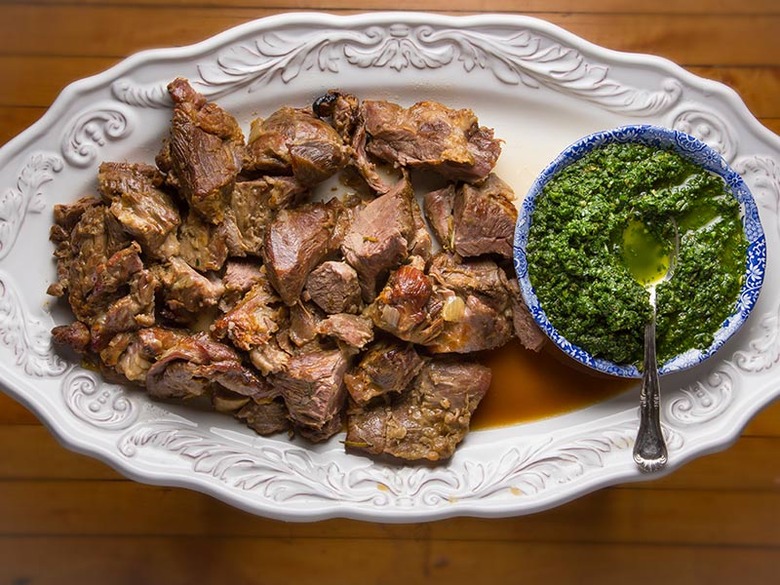 Give lamb shoulder a star turn on your table with this melt-in-your-mouth slow-cooked dish, brightened with a punchy sauce of pounded herbs. See the recipe.