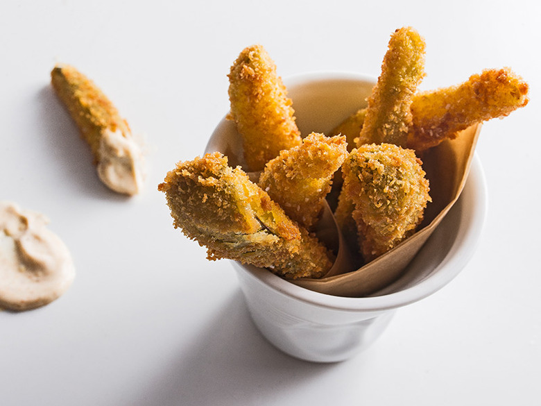 These late-night bar-snack classics get a makeover from rounds to spears. Dredge the pickles in a bit of flour, dip into some beaten eggs, dredge in panko (Japanese bread crumbs) and fry up a crunchy, briny snack.