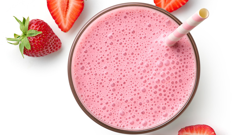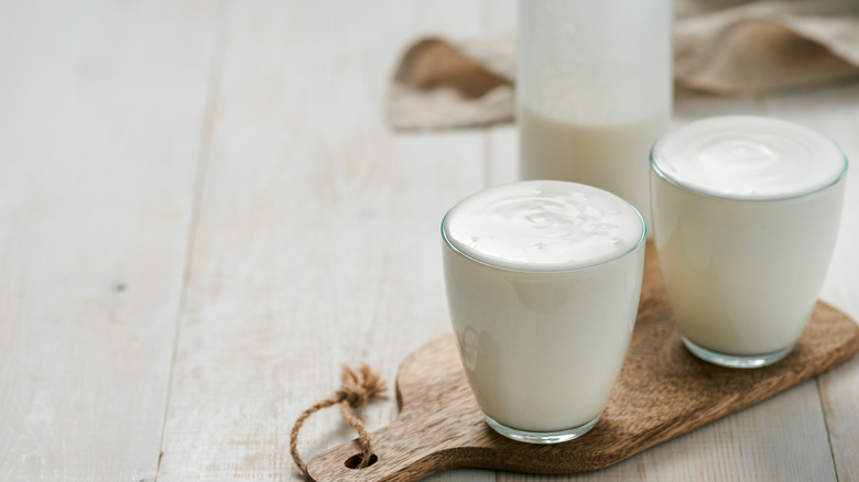 Buttermilk contains about the same amount of protein per cup as regular, whole milk (via the USDA), and both can be excellent ingredients to add to fruit smoothies to get an added boost of protein in your daily intake. Buttermilk has the same added benefit of active cultures as yogurt or kefir, all of which may contribute to better digestion. All of these probiotics are made up of a combination of the good bacteria that our bodies need to fight off disease-causing bad bacteria.