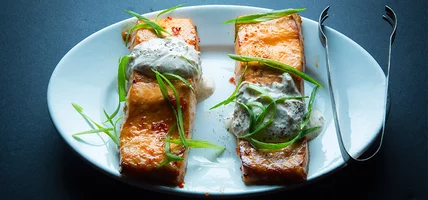 This salmon dish is bursting at the seams with flavor. The no-cooking-required sauce is a savory tug-of-war of soothing and spicy that no one wins, with hits of chile spice countered by refreshing yogurt.