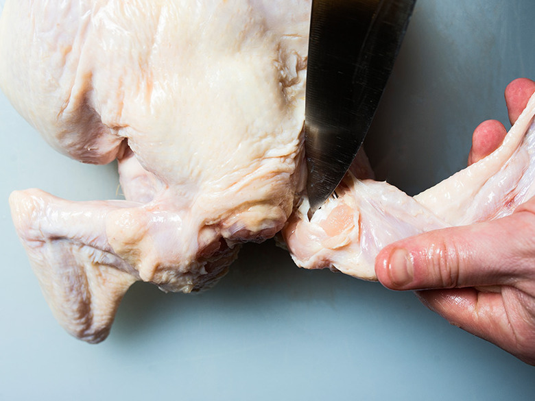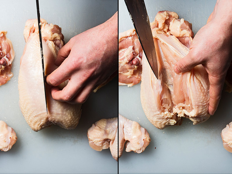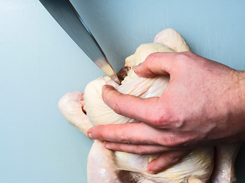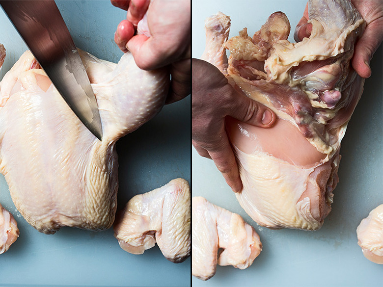 Remove the wishbone: This step might not seem that important, but it's actually crucial when breaking down a chicken, because it allows for clean, even cuts when removing the chicken breast. Working breast-side up, pull the neck skin down from the chicken and feel around for the V-shaped wishbone. Make small incisions on both sides of the wishbone until it's easily detachable, then simply pull the whole thing out.