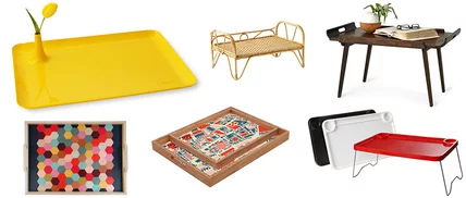 Now, when we get into the details of the tray, things become a tad more complicated: Do you want legs or no legs? Stately wood or cheery patterns? Do you go for the upgrade with a built-in bud vase or please the boozehound with a Champagne-bottle holder?