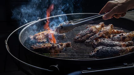 Because pimento wood branches aren't easy to find here in the U.S., we prepare a charcoal grill for indirect heat and add a handful of soaked allspice berries and bay leaves directly over the charcoal. Once the leaves and allspice begin to smolder, we place the chicken on the cooler side of the grill, cover (DO NOT PEEK INSIDE!) and cook low and slow, so that the smoke infuses into the meat and cooks the chicken. Once the chicken is done, we uncover it, add more soaked bay leaves and allspice berries, and cook it directly over the coals until it's charred, crisp and perfectly jerked.