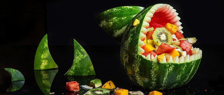 The second attempt was anchored by succulent August watermelon, and I took full advantage of the entire fruit, pickling the rinds for a salty tang. In order to entice the "I don't eat sweet foods" crowd (yawn), I included a beloved savory fruit that's often labeled a vegetable: the avocado. I tossed it all with a shot of agave and spiked it with crushed spicy Aleppo pepper and citrusy sumac. I finished it off with crunchy macadamia nuts and toasted coconut flakes for a vibrant, tropical watermelon fruit salad. (I served it in a watermelon carved into a shark's head, which of course is optional.) No longer a forgettable side, this is truly the star of the dinner table.