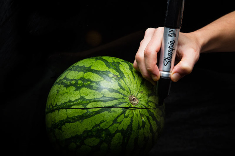 Turn the watermelon upright so it is standing on its base. Draw a half moon-shaped mouth, beginning at the stem mark as a guideline.