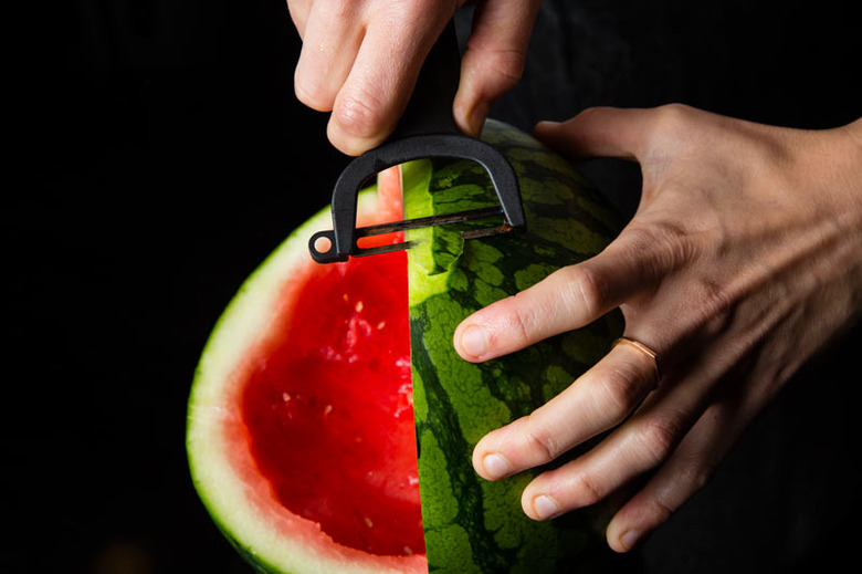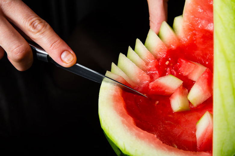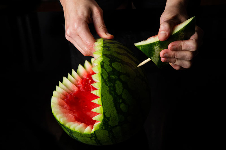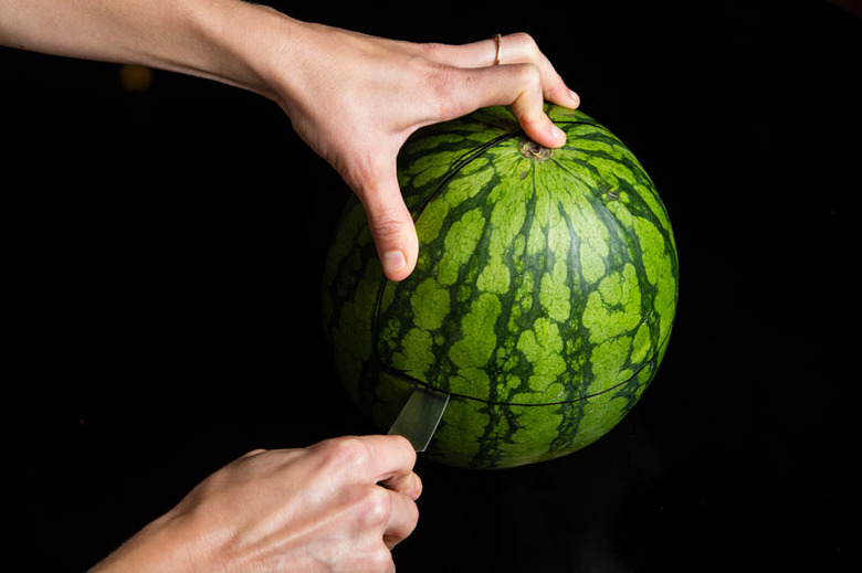 Use a large sharp knife to cut off the wider end of the watermelon so it stands at an angle.