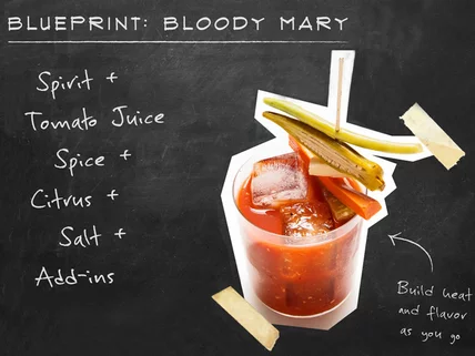 Balance your act. The key to any good Bloody Mary is balance. For the base, a good rule of thumb is to have about 3 parts tomato juice to 1 part everything else. After you've nailed that, the ratio of booze to base is equally important. The golden ratio: 5 parts base to 2 parts spirit.