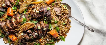 Whether or not you're celebrating Rosh Hashanah, the dish is a showstopper: The meat is rich and tender; the grains are warmed with the spices of the Middle East like cinnamon, allspice, cardamom and orange peel; and a handful of fresh herbs adds a bright note. The recipe, like most good holiday dishes, requires some serious time in the kitchen, but Shaya says once it's done, so is most of the meal. "The mujadara is kind of a meal in itself. I would serve it with a salad—something lighter and crisper to cut through the richness."
