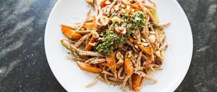 "Spelt flour is lower in gluten and protein. It gives the pasta a softer, sexier bite," Kalman explains. "As a chef, one of my big beliefs is to use everything. We slow-roast the carrots, then blanch and chop the tops to make the pesto. You want it to be all about the carrots and the pasta. Everything else should be supporting ingredients."