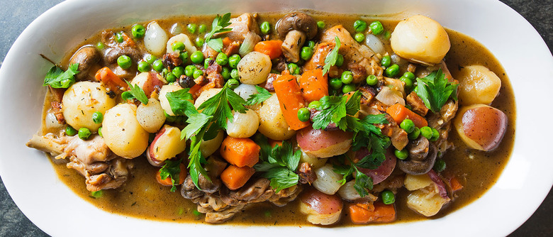 The recipe, which appears in Pépin's newest cookbook, Jacques Pépin: Heart & Soul in the Kitchen, is a quintessential French country dish made at home more often than in restaurants. It easily bends to accommodate the seasons and highlights what's just come into the market, like sweet potatoes, parsnips and chestnuts in the winter; fresh peas in the spring; and potatoes to make the dish hearty year-round. When we ask what he would serve with the dish for a complete meal, Pépin laughs: "I would serve that with a fork and knife." Adding a simple salad and a piece of cheese would easily round out a Sunday supper.